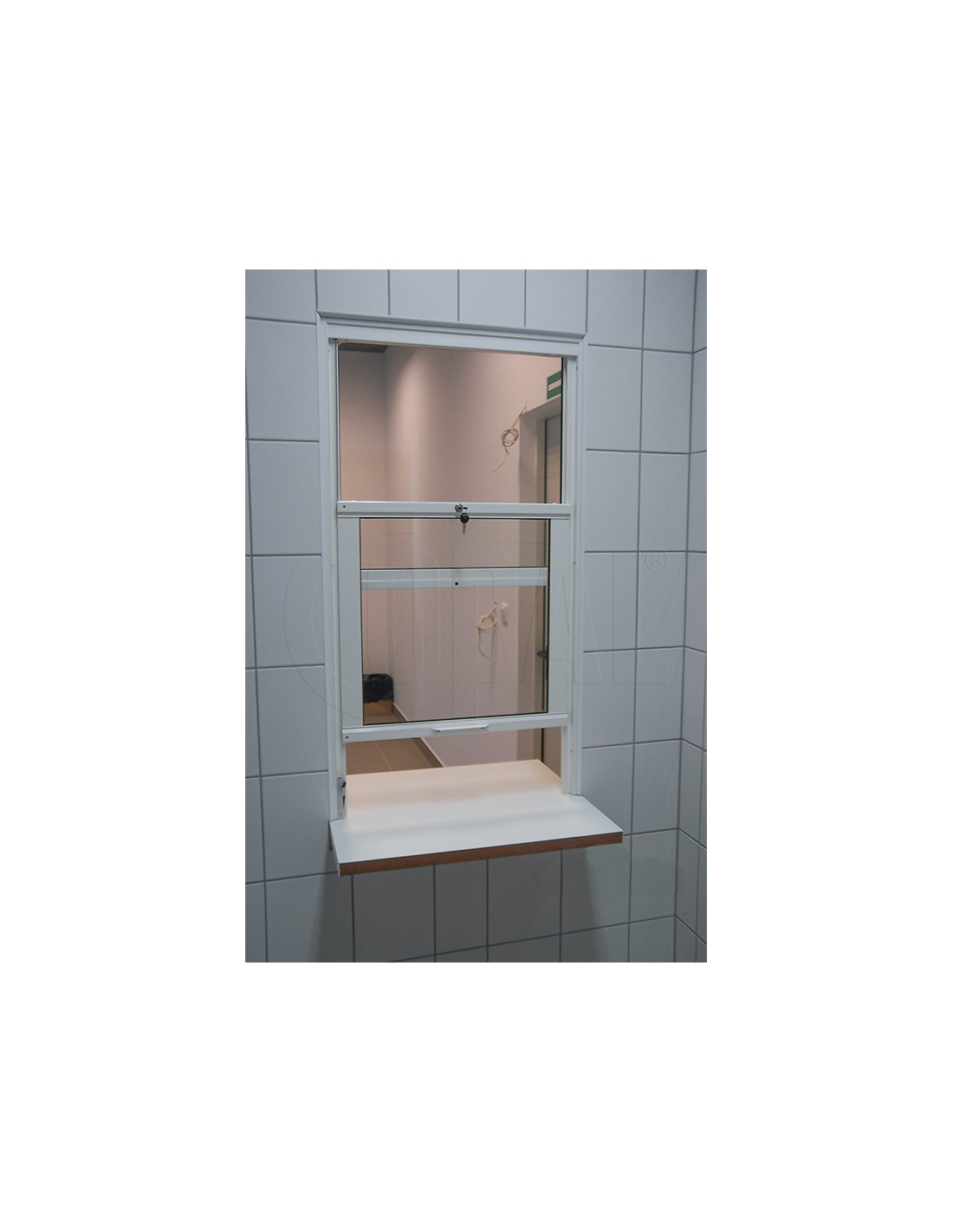 Feeder and cashier windows made on an aluminium profile with VSG 33.1 (6.4 mm) glass. The window can be slid both vertically and horizontally. Window with actuator. Smaller constructions can be made without an actuator.
